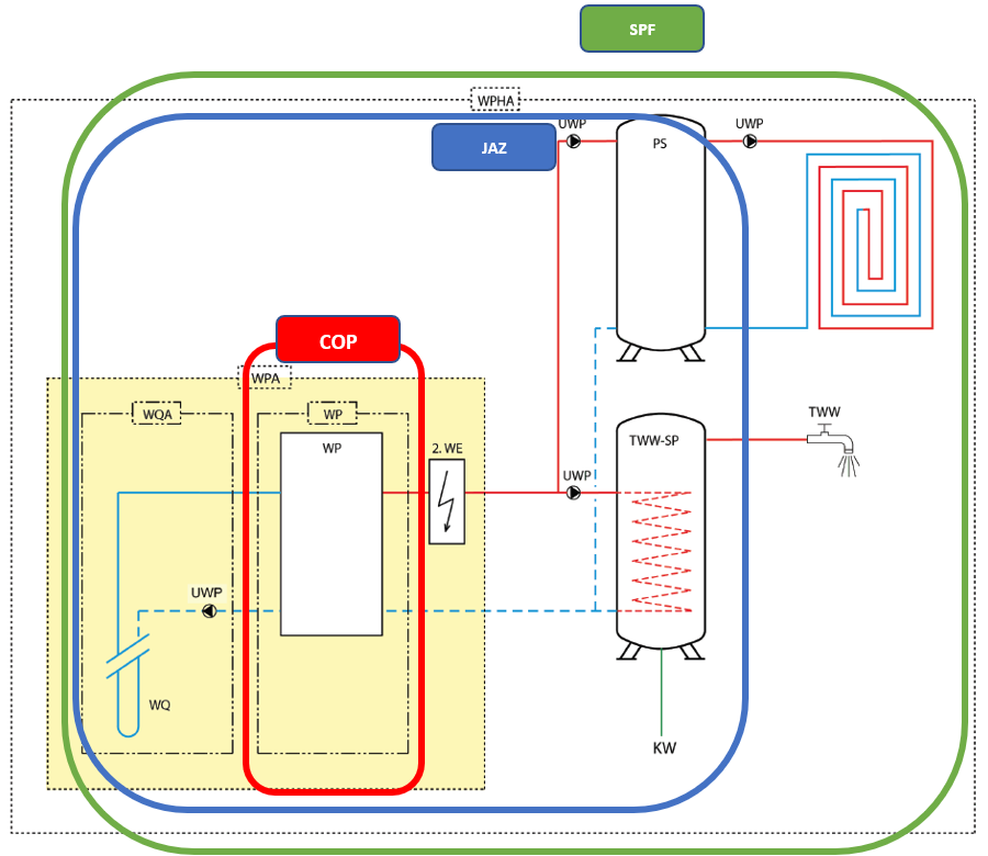 Zusammengefasst betrachtet der COP nur die Wärmepumpe bei einer Temperatur. Der SCOP betrachtet die Wärmepumpe bei unterschiedlichen Temperaturen (+12°C; +7°C; +2°C; -7°C). Die JAZ berechnet sich aus theoretischen Annahmen für Trinkwasser und Heizung sowie ggf. der Nutzung eines zusätzlichen Wärmeerzeugers. Der SPF basiert auf real vor Ort gemessene oder abgelesene Werte aus dem Wärmepumpen-Regler. In der VDI 4645 finden sich die jeweiligen Bilanzierungsgrenzen.
