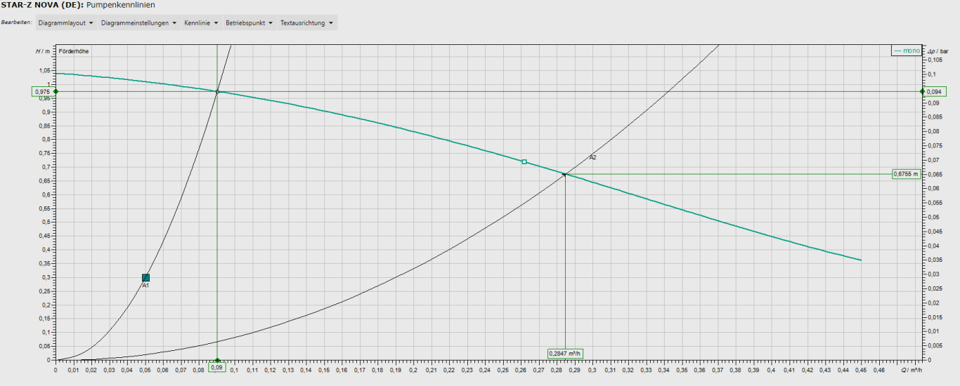 Übertragen wir diesen Wert in das Pumpendiagramm und legen dazu einen angenommenen Druckverlust von 30 mbar zugrunde, dann ergibt sich der in Bild 2 gezeigte Betriebspunkt der Zirkulationspumpe. Überdimensionierung mit fatalen Folgen Deutlich wird, dass sich durch das