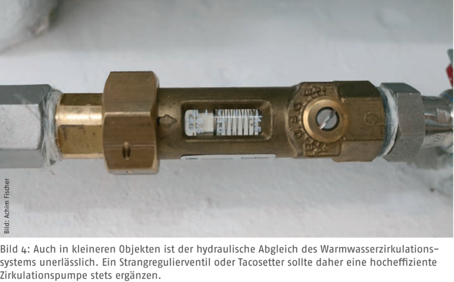 Viele Fachhandwerker verlassen sich darauf, dass moderne Zirkulationspumpen thermostatisch und/oder über Zeitschaltuhr bedarfsgerecht geregelt werden. Das ist richtig und wichtig, doch hat dies keinen Einfuss auf die so wichtige Massenstrombegrenzung. Auch in kleineren Objekten ist der hydraulische Abgleich des Warmwasserzirkulationssystems unerlässlich. Ein Strangregulierventil oder Tacosetter sollte daher eine hochefziente Zirkulationspumpe stets ergänzen.