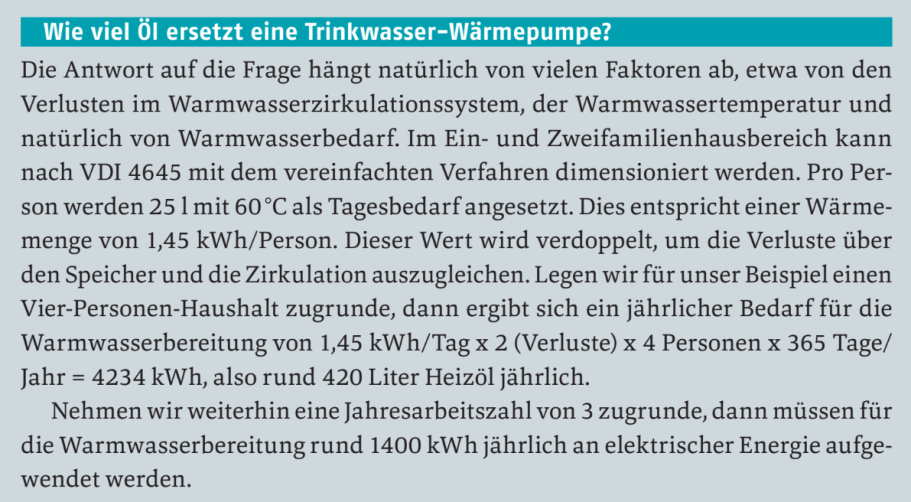 Vor- und Nachteil zugleich ist die relativ geringe Heizleistung der Wärmepumpe. Die Leistungsaufnahme typischer Geräte liegt bei 400 bis 600 Watt. Dementsprechend beträgt die Leistung je nach Zuluftemperatur zwischen 1,5 und 2 kW. Duschen oder baden mehrere Personen rasch hintereinander, so kann die Wiederaufladezeit bis zu 10 Stunden betragen. Die geringe Leistungsaufnahme ist aber in Kombination mit einer PV-Anlage ein großer Vorteil, schließlich lässt sich über den Tag verteilt der eigene Strom nutzen. Dank der heute in den meisten Geräten eingebauten Schnittstelle SG-Ready lässt sich das Temperaturniveau bei Überschussstrom von z. B. 55 °C auf 62 °C erhöhen. So lässt sich PV-Strom thermisch speichern.