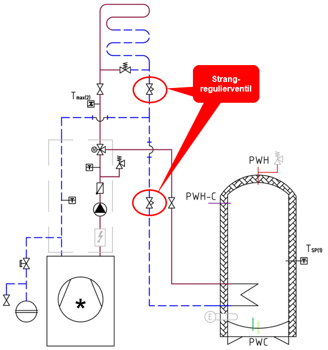 3. Wenn beides nicht möglich ist, sollte der Volumenstrom für die Warmwasserbereitung über ein Abgleichorgan (Tacosetter/Strangregulierventil) angepasst werden.
