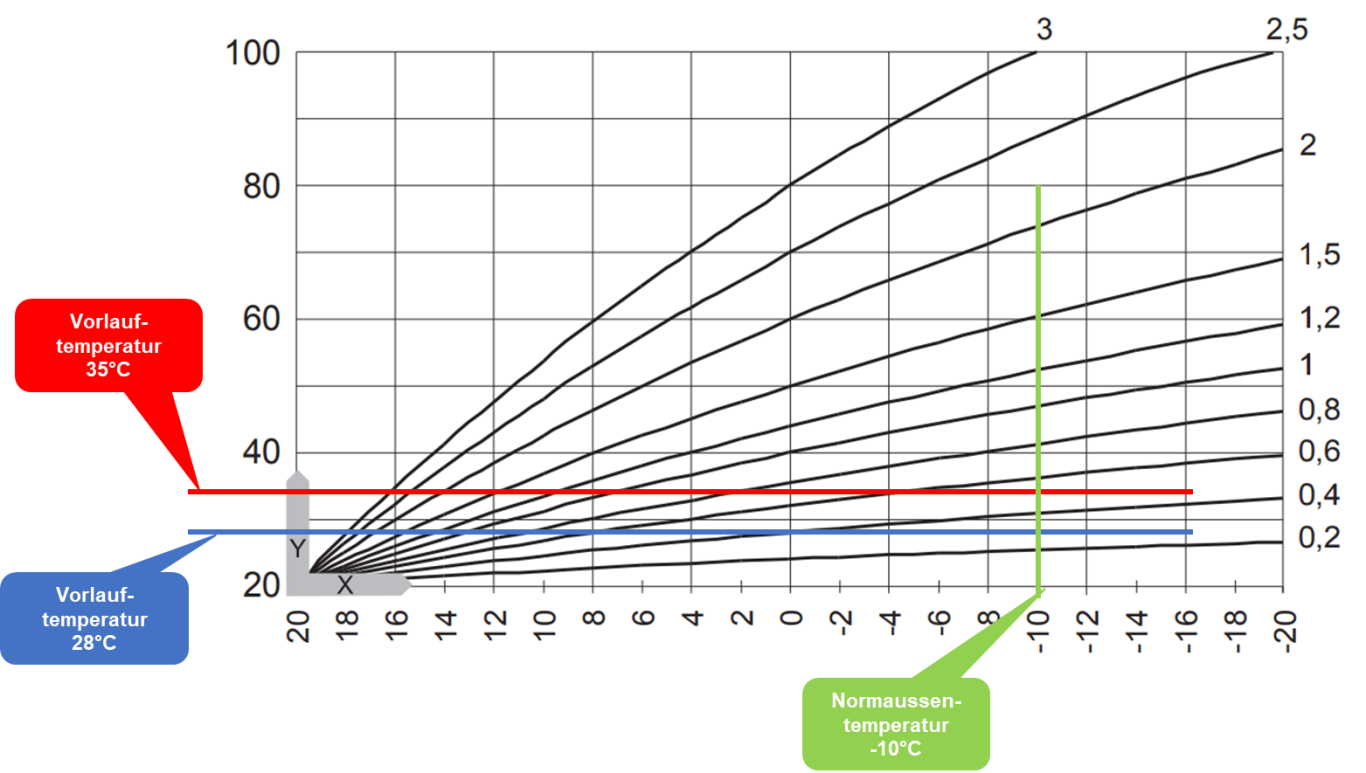 Es kommt aber noch ein wesentlicher Aspekt dazu: Je nach Wärmepumpenersteller bezieht sich die Einstellung der Heizkurve auf die Vorlauf- bzw. auf die Rücklauftemperatur. Das bedeutet, dass bei einigen Herstellern die Heizkurve nach der Rücklauftemperatur eingestellt werden muss. Hierzu ein kurzes Beispiel. Die Heizkurve für eine Fußbodenheizung in einem Neubau soll eingestellt werden. Die Auslegung der Fußbodenheizung wurde mit 35/28 °C vorgenommen.