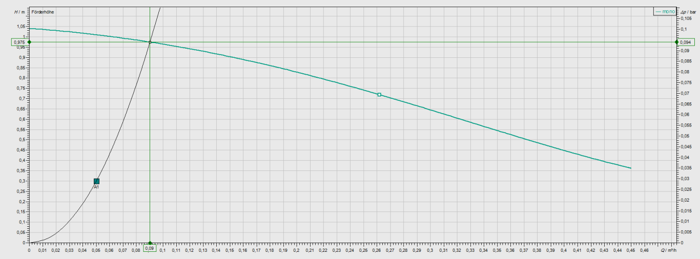 Auf der Y-Achse fndet sich die Förderhöhe (m) und auf der X-Achse der Volumenstrom (m³/h). Der Massenstrom auf der X-Achse ergibt sich aus der Anlagenhydraulik. Genau hier zeigt sich der erforderliche Handlungsbedarf, auch und insbesondere, wenn nur ein Zirkulationsstrang in dem